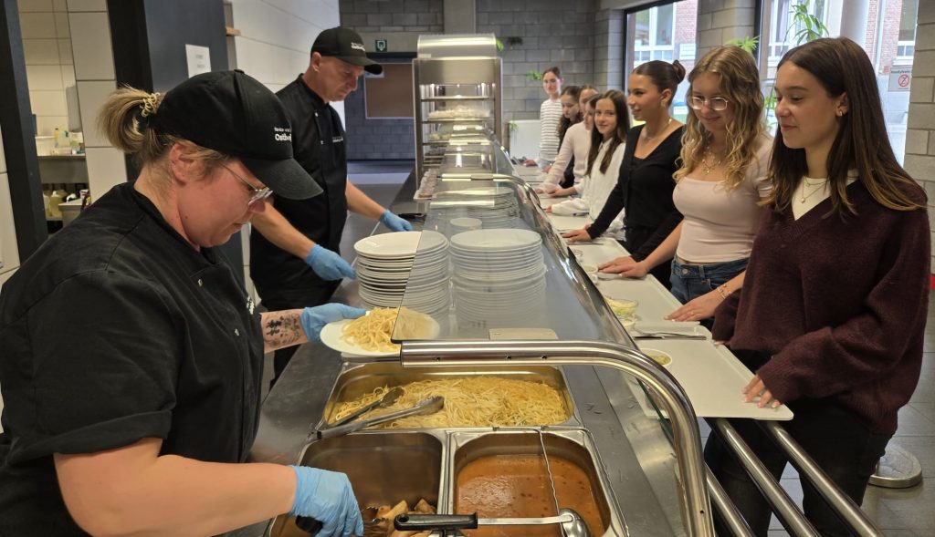 In der Mittagspause steht zusätzlich ein warmes Menü zur Verfügung, bestehend aus Suppe, Hauptgericht und Dessert – ganz ohne vorherige Reservierung. Eine vegetarische Alternative wird ebenfalls angeboten. Auf Wunsch kann ein frischer Salat zum Preis von 2,50€ vorbestellt werden. In unserer Kantine gibt es ein digitales Banksystem. Bezahlt wird mit einer aufladbaren Karte. Eine Barzahlung ist jedoch weiterhin möglich.